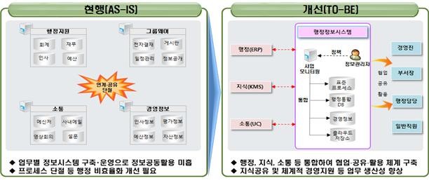 이번 행정정보시스템 구축은 과거 관행을 타파하고 일하는 방식 혁신을 위한 '열린혁신' 지침에 따라 진행된 사업으로, 불필요한 행정업무를 줄이기 위해 부서별, 업무별로 흩어진 지식을 체계화해 자료 검색 및 활용이 가능하도록 했고 휴가·외근·출장 등 수작업으로 관리하던 근태관리를 서로 연계 시스템화했다.