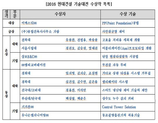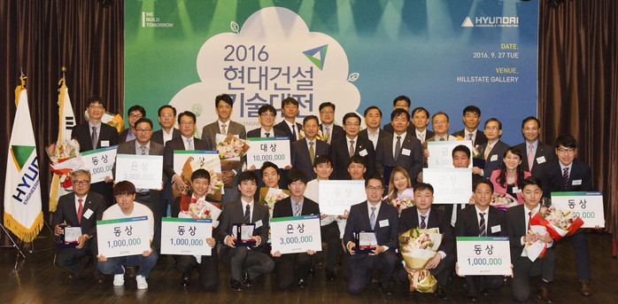 [화학신문 김영민 기자]현대건설이 중소기업과 상생협력을 도모하고 국내외 대학(원)생의 창의적 아이디어 발굴로 미래 건설기술을 이끌기 위해 마련한 '2016 현대건설 기술대전' 시상식을 27일 개최했다.