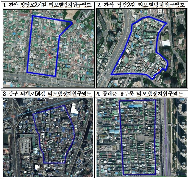 시에서 지정한 리모델링지원구역(14개 구역)으로 6개 구역(뉴타운·재개발 해제구역 등 노후불량 주택이 밀집한 지역)은 ▲봉천동 892-28일대(16,000㎡) ▲봉천동 14일대(32,605㎡) ▲장충동2가 112일대(40,468.1㎡) ▲용두동 102-1일대(53,000㎡) ▲광희동2가 160일대(16,745㎡) ▲황학동 267일대(199,300㎡)다.