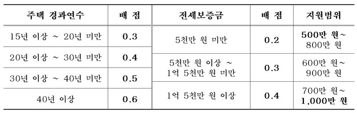 지원금 산정 주택 경과연수 및 전세보증금액별 차등 점수 부여