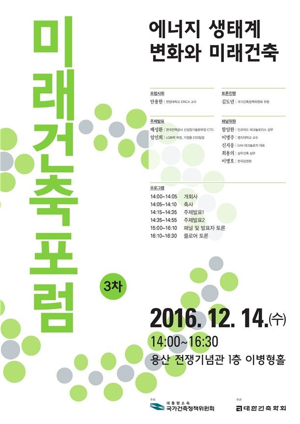 대통령소속 국가건축정책위원회(위원장 제해성)는 대한건축학회에 함께 건축 분야의 미래 이슈를 공유하고 대응 전략 등을 논의하는 세 번째 '미래건축포럼'을 14일 오후 2시에 용산 전쟁기념관 이병형홀에서 연다.