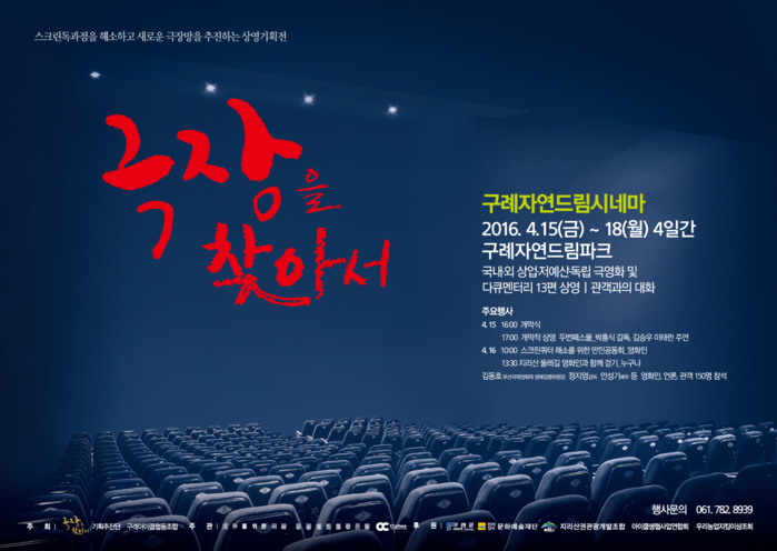 [화학신문 김영민 기자] 스크린독과점 개선의 취지에 공감하는 영화인들(극장을찾아서기획추진단)이 스크린독과점 해소방안을 모색하는 상영행사 '극장을찾아서'를 기획, 4월 15일부터 18일까지 4일간 구례자연드림파크 내 구례자연드림시네마에서 처음 행사를 연다.
