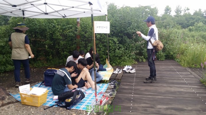 또한 포충망을 들고 수풀을 누비는 육상곤충교실, 뜰채를 들고 물자라 등을 호수에서 직접 채집해 관찰하는 물속동물교실, 습지단면 모형을 통해 습지의 형성원리와 구조에 대해서 배우는 습지생태교실 등 흥미진진한 수업이 3시간동안 진행됐다.