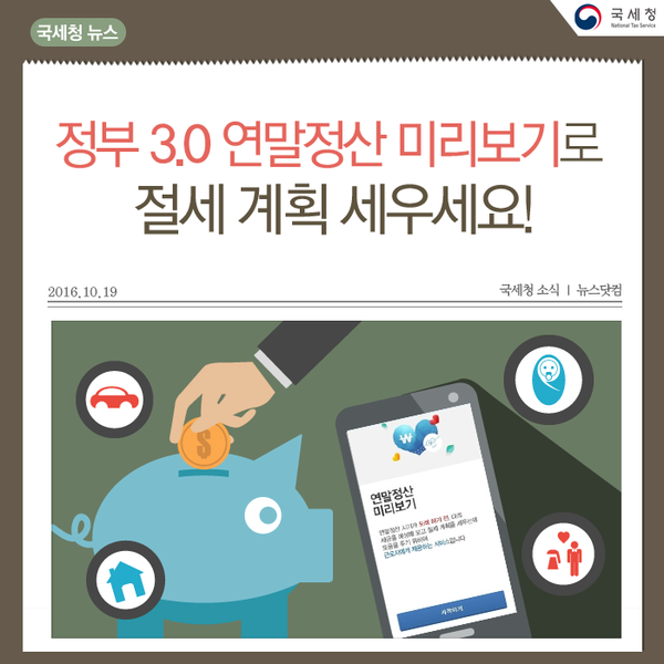 [화학신문 최인배 기자]국세청은 근로자가 미리 절세 계획을 수립할 수 있도록 정부 3.0 국민 맞춤형 서비스인 '연말정산 미리보기' 서비스를 20일부터 개시 다양한 정보 제공에 들어갔다.