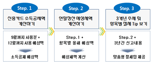 올 9월까지의 신용카드 등의 사용액을 미리 알려줘 12월까지 결제 수단을 선택할 수 있게 돕고 자동으로 채워준 지난해 공제액을 참고해 올해 공제 예상액을 입력하면 연말정산 예상세액을 계산해 주며 또한, 근로자별 최근 3년간의 연말정산 추세와 항목별 공제 한도, 절세 팁, 유의 사항도 안내한다.