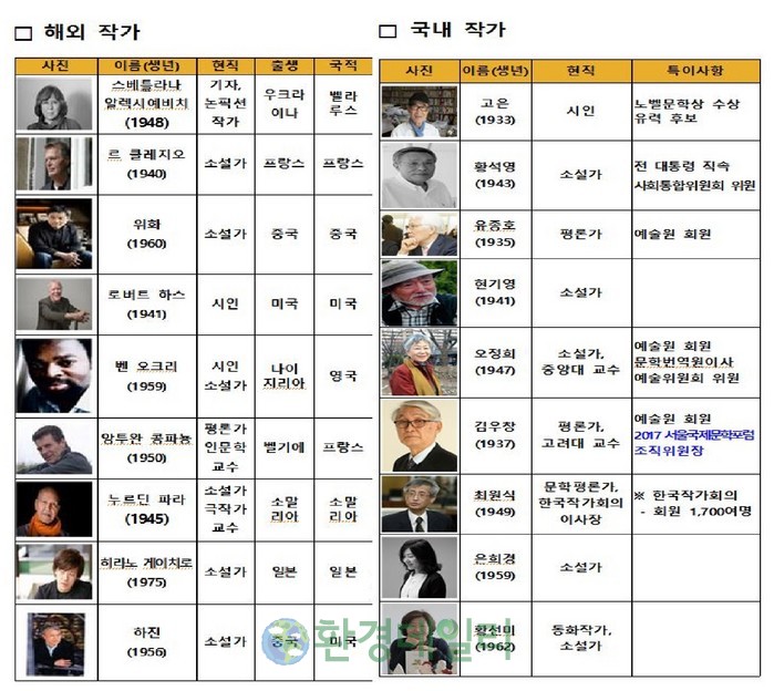 올해 대회에는 해외에서 ▲장-마리 르 클레지오(프랑스, 소설가, 2008년 노벨문학상) ▲스베틀라나 알렉시예비치(벨라루스, 논픽션 작가, 2015년 노벨문학상) 등 2명의 노벨문학상 수상 작가와 ▲위화(중국, 소설가) ▲로버트 하스(미국, 시인) ▲벤 오크리(영국, 시인·소설가) ▲앙투완 콩파뇽(프랑스, 평론가) 등 10개국의 저명작가 13명이 참석한다.