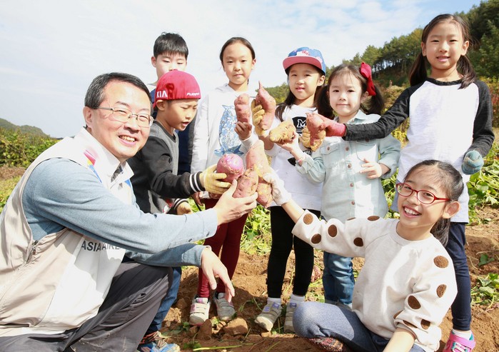 | ▲아시아나항공 임직원 가족 125명이 22일 강원도 홍천군 산초울마을을 찾아 일사일촌 봉사활동을 실시했다. 아시아나항공 김수천 사장(왼쪽 첫번째)이 김연두양(왼쪽 여덟번째)을 비롯한 임직원 자녀들과 함께 캔 고구마를 들어보이고 있다. |