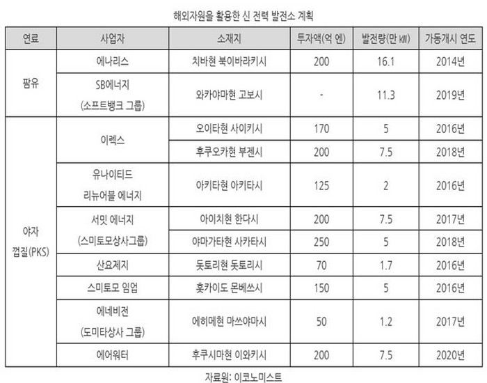 재생가능 에너지 발전의 가능성이 뛰어난 바이오매스 발전소이 점차적으로 태양광 발전을 대신할 것으로 예상되면서 일본은 태양광 발전에 비해 상대적으로 싼 바이오매스 발전이 각광을 받음에 따라 팜유, 야자 껍질 등 해외 자원을 사용한 신 전력 발전소 계획으로 버블화 조짐이 현실적으로 피할 수 없게 됐다.