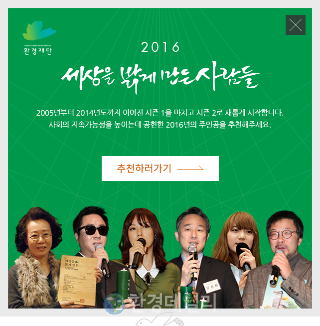 환경재단(대표 최열)은 2005년부터 10년간 시즌 1을 진행하며 '세상을 밝게 만든 사람들'을 통해 사회의 지속가능성을 높이는데 공헌한 개인이나 단체를 455팀 선정해왔습니다.