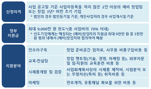 (예비)창업자 자격은 사업화 아이디어를 보유한 2인 이상의 예비 창업팀 또는 업력 3년(공고일 기준) 미만의 초기 창업기업이며, 이번에 20개 사를 선정할 예정이다.