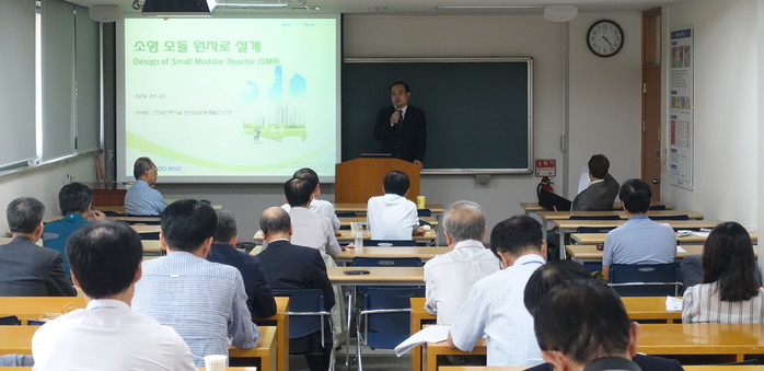 강의는 '소형 모듈 원자로(SMR : Small Modular Reactor) 설계'라는 주제에 따라 ▲세계 주요 소형모듈원자로 개발 현황 ▲소형모듈원자로 목표 시장 ▲소형모듈원자로 설계 요건 ▲한전기술의 소형모듈원자로 개발 전략 및 현황 등으로 진행됐다.