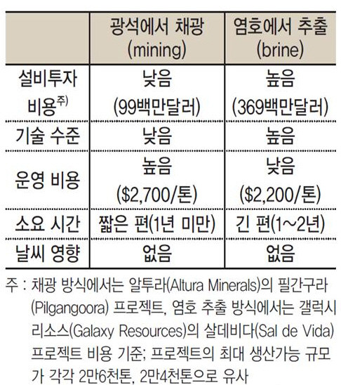 수산화리튬을 생산하기 위해서는 광석에서 추출 시 석회법을 사용하거나, 탄산리튬을 재가공해 만들어야 하기 때문에 추가적인 비용이 발생한다. 그러나 장기적으로 전지용 수산화리튬 필요성이 더 높아진다면, 규모의 경제를 통한 생산 원가 절감의 선순환이 실현될 여지가 있다.