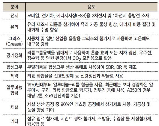 리튬은 유리 제조, 윤활유 첨가제, 항공기 합금 등 전지 외에 이미 다양한 목적으로 사용되고 있다.
