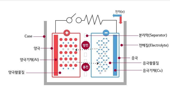 | ▲2차전지는 리튬이온이 양극, 음극 사이를 이동하며 전기를 생산하는 구조다. <제공 LG화학> |