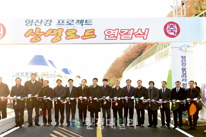 [화학신문 이수진 기자]경주시와 포항시는 25일 강동면 유금리와 연일읍 유강리 경계 형산강변에서 최양식 경주시장, 이강덕 포항시장, 박명재 국회의원 등 기관단체장과 시민 500여명이 참석한 가운데 형산강 프로젝트 선도사업인 '형산강 상생로드' 연결식을 가졌다.