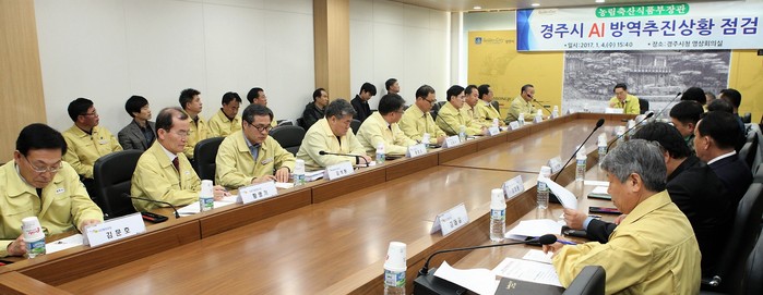 경주시는 지난달 16일 AI 심각단계 시장주재 대책회의에서 소규모 농가의 가금류를 선제적으로 살처분하는 등 예방조치와 양계농가의 방역의지를 고취했으며, 도내 비접경지역에서는 가장 먼저 거점소독소와 통제초소를 운영하는등 선제적 방역조치를 실시했다