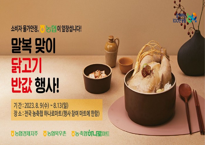 이번 행사는 외식 물가상승으로 인한 소비자 부담을 줄이고 말복을 맞이해 늘어난 보양식 수요에 부응하기 위해 마련했으며, 닭고기·삼계탕 등 12종의 농협목우촌 제품을 50% 할인한다.