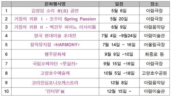 공연 내용은 세부 내용이 확정되는 대로 고양문화재단(www.artgy.or.kr)와 페북(@artsgoyang)에서 확인할 수 있다.