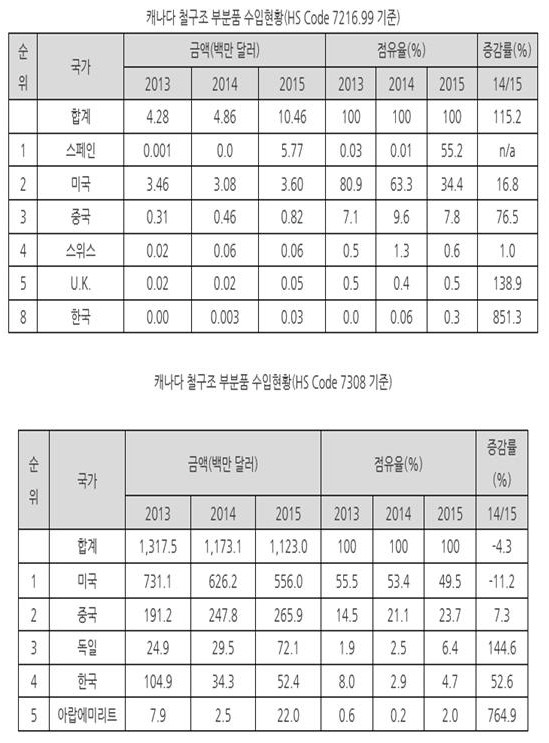 한편 캐나다 수입현황을 보면, 한국산 철구조 부분품 수입은 지난 2014~2015년 대폭 증가했다.