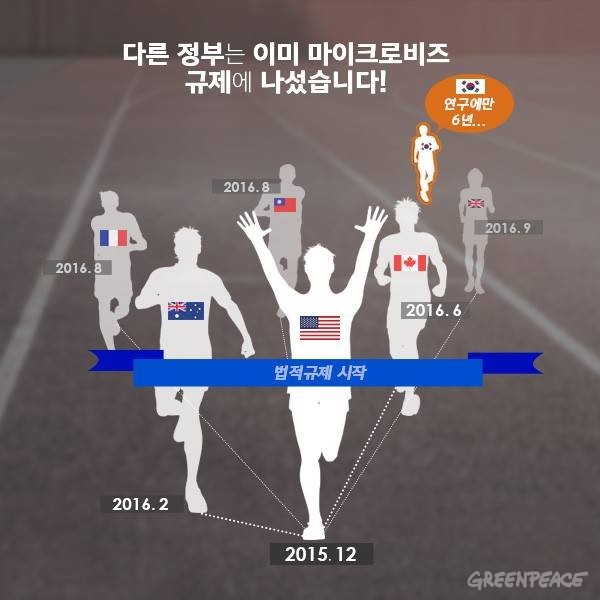 반면 한국 정부는 늑장 대응으로 일관하고 있다. 마이크로비즈 관련 부처인 환경부, 해양수산부, 식품의약품안전처는 문제 규명을 위한 연구기간만 3년 이상으로 잡거나 타 부처에 책임을 전가하고 있다. 마이크로비즈가 국민 건강을 위협할 수 있는데도 제대로 된 정책 대응이 전무한 상태다.