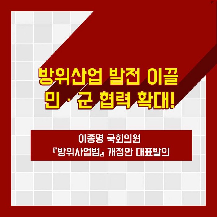 이종명 의원은 최근 민간부문 공동활용 확대 차원의 '방위사업법' 개정안을 대표 발의했다고 밝혔다.