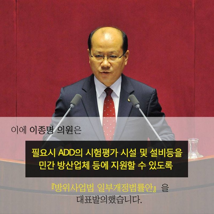 이종명 의원은 법개정 취지와 관련 "자주국방의 극대화와 국방 예산을 효율적으로 쓰기 위해서는 방위산업을 한 단계 끌어올려야 하는데 그 중심이 바로 민간 영역의 기반과 공유에 있다."고 강조했다.