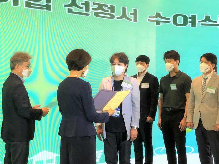 | ▲그린뉴딜 유망기업으로 선정된 아코플래닝 김지언 대표이사(사진 가운데, 회색자켓)가 선정서를 한정애 장관으로 부터 받고 있다. 이 회사는 재생가족 재활용 자원순환에 기여해 유망기업으로 해외 수출까지 발돋움을 가능성이 있다고 판단돼 선정됐다. |