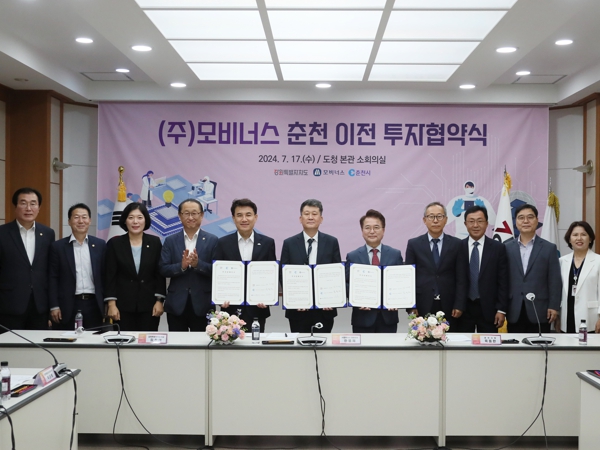 이날 투자 협약식은 김진태 강원특별자치도지사, 육동한 춘천시장, 한병채 ㈜모비너스 대표이사 등 10여 명이 참석한 가운데 진행됐다.