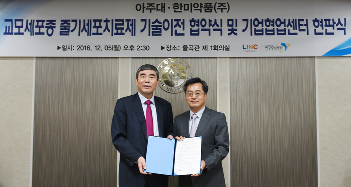 | ▲한미약품 이관순 대표이사와 아주대학교 김동연 총장이 지난 5일 줄기세포 활용 혁신 항암신약 개발 계약식을 체결했다 |
