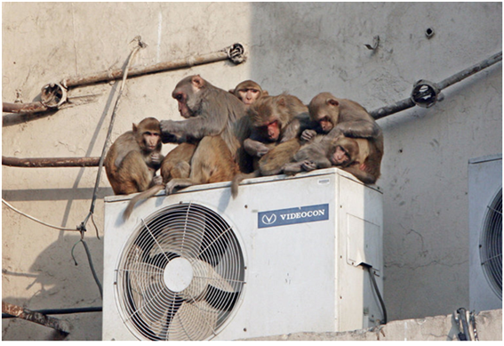 ▲에어컨의 보급은 전 세계적으로 급증하고 있는 추세 개발도상국인 인도 뉴 델리(New Delhi) 대도시에서 에어컨 위에 원숭이들이 자리 잡고 쉬는 모습. (출처: The New York Times.) |