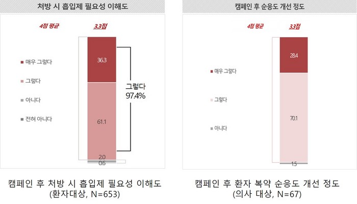 또한 87.9%의 환자가 교육 후 흡입제를 꾸준히 사용하는 것이 천식 및 COPD 치료에서 가장 중요하다는 것을 인지했고, 교육받은 내용 중 기억에 남는 흡입치료의 장점으로 47.2%의 환자가 '흡입 치료의 효과성', 35.8%의 환자가 '속효성', 35%의 환자가 '적은 부작용'을 꼽은 것으로 나타났다. 교육자료 배포 및 캠페인 진행 후, 환자의 복약 순응도가 개선됐다는 의사의 견해도 98.5%로 매우 높게 나타났다. 캠페인 기간 중 실제 흡입제 처방 비율 또한 57.6%에서 72.7%로 26.2%포인트 증가했다.