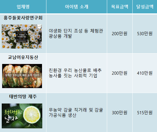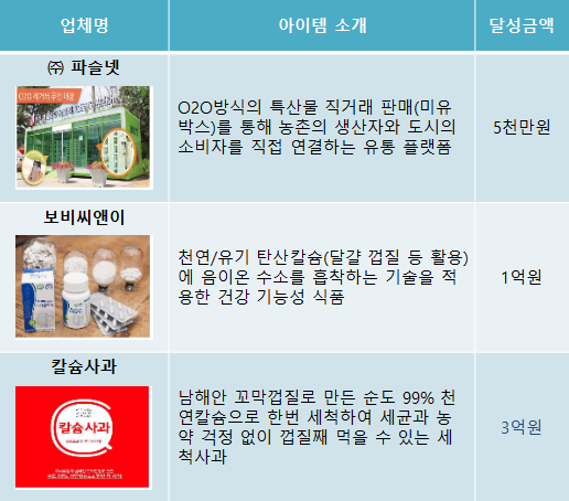 2016년 10월 현재 총 17개 기업이 농식품 전용관을 통해 크라우드 펀딩을 완료, 이 중 증권형 크라우드펀딩 3개 기업을 포함한 12개 기업이 펀딩에 성공한 상태다.