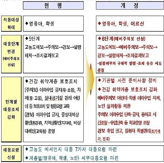 대응조치 강화는 미세먼지 주의보가 발령될 경우 야외수업 단축·금지, 등하교 시간 조정 등 미세먼지 경보가 발령될 경우 휴업 권고, 질환자 조기 귀가 등 미세먼지 농도 단계별로 대응조치를 강화했다.