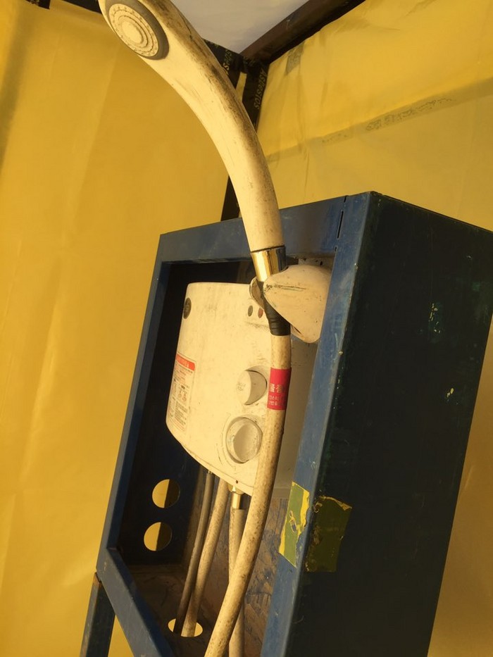 이와 관련, 시 관계자는 처음에는 "작업장내 샤워부스가 있다."고 말했지만, 현장감리 책임자는 "작업장내에 그런 시설이 없고 외부계단에서 설치된 샤워부스를 이용한다."고 했다.
