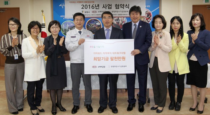 [화학신문 이은수 기자] 경기도 광명시(시장 양기대)는 지난 27일 광명시사회복지협의회(회장 서일동), 기아자동차 소하리공장(공장장 김창석)과 2016년 기아위드 지역복지 네트워크 지원 사업을 위한 기금 협약식과 기탁식을 진행했다.