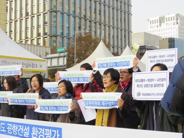 이날 기자회견에서 녹색연합 황인철 국장은 "가뜩이나 지역의 공항들이 만성 적자에 시달리는 와중에 예비타당성 조사에서 수요를 과도하게 부풀려 예측해 경제성을 조작한 것은 국민의 혈세를 낭비하고 우리의 미래를 파괴하는 일"이라면서 "이는 타당성 없는 설악산 국립공원 오색 케이블카 건설 사업과 본질적으로 같은 것"이라고 주장하며 두 사업 모두 중지해야 마땅하고 강조했다.