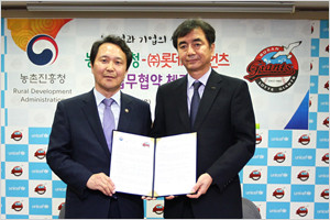 [화학신문 이은수 기자] 농촌진흥청(청장 이양호)은 21일 롯데자이언츠(대표이사 이창원)와 부산 사직야구장에서 농업과 기업이 상생 협력하기 위한 업무 협약을 맺었다.