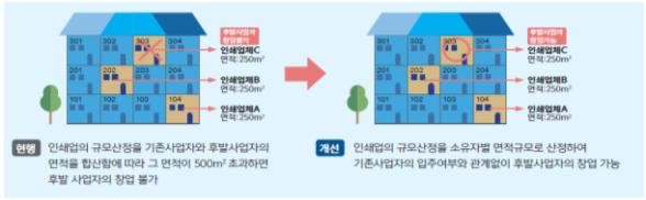 부동산중개소, 금융업소등은 주거생활 필요시설임에도 규모에 관계없이 제2종근린생활시설로 분류돼 주거지역 입지제한 등의 불편이 있어 30㎡이하 소규모는 제1종근생시설로 포함 앞으로는 전용주거지역 또는 지구단위계획 구역 내 점포형주택에 주민밀착형 시설의 입지로 소규모 창업이 가능하도록 했다.
