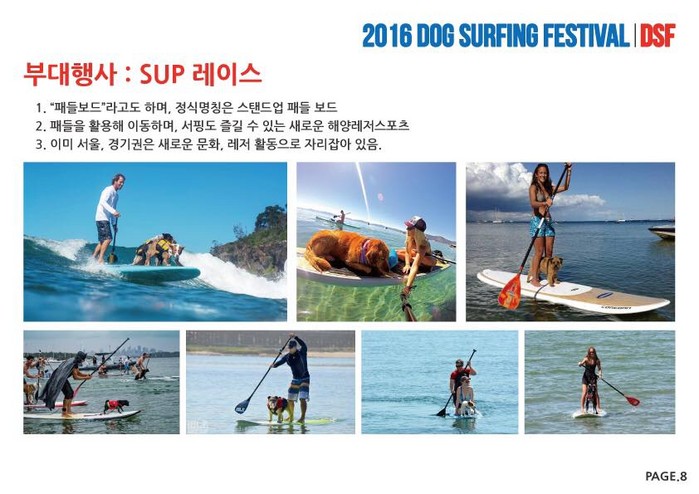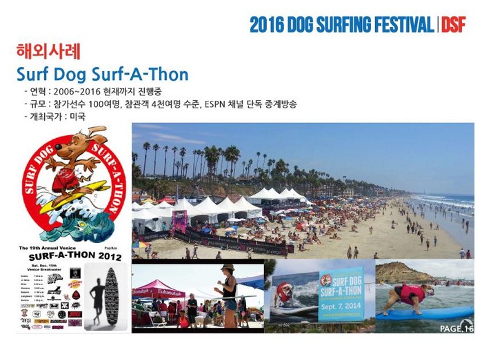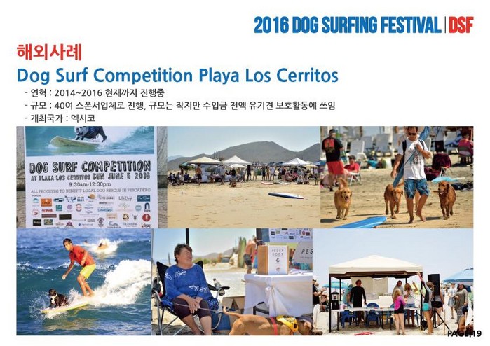 '제1회 반려견과 함께 하는 서핑 페스티벌'(2016 DOG SURFING FESTIVAL)은 반려견과 함께 서핑 대회도 주목받는 이유는 크게 세가지다. 유기견 발생을 줄이자는 것과 애견산업 부흥, 동물보호단체 지원이다.
