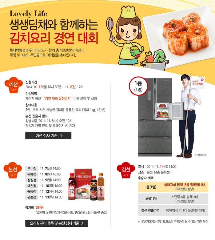 롯데백화점과 위니아만도는 생생딤채와 함께하는 김치요리 경연대회인 쿠킹 토크쇼의 주인공을 찾는다.