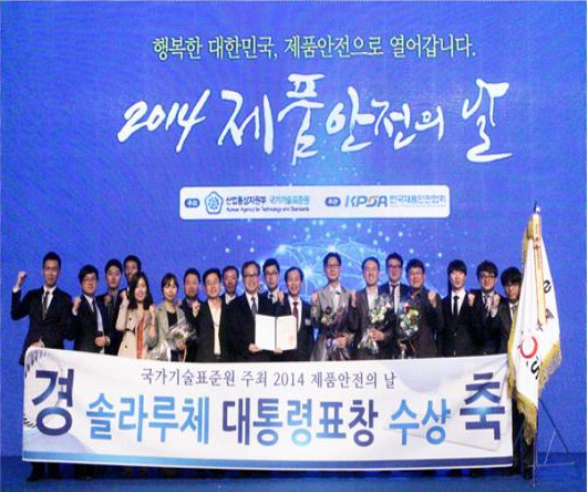 LED조명 기업 솔라루체(대표 김용일)가 2014년 제품안전의 날 시상식에서 LED업계 최초로 단체 부문 최고상인 '대통령 표창' 영예를 안았다.