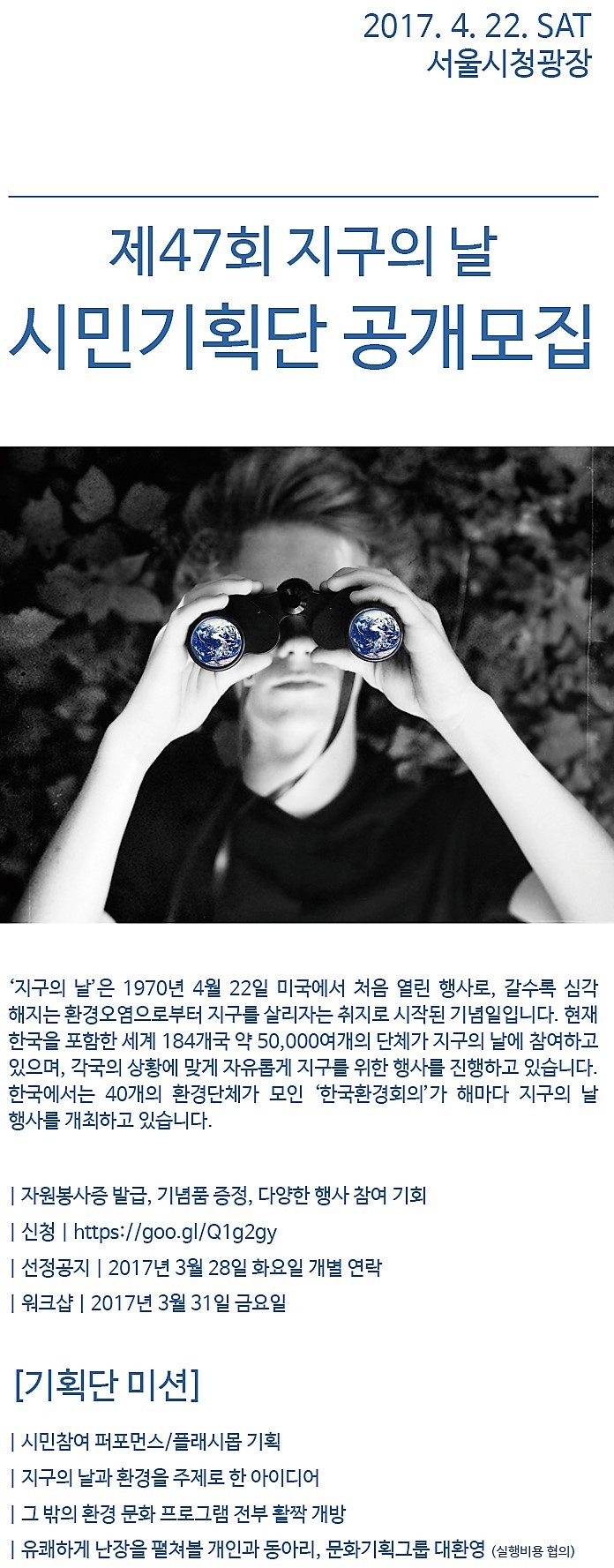 서울환경연합은 제 47회를 맞는 지구의날에 시민의 흥과 끼를 지구와 환경을 소중히 하는 마음을 한번 더 보여주는 시간을 마련한다.
