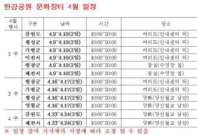 서울시(한강사업본부)는 4월~10월까지 한강유역에 있는 경기도 이천시, 가평군, 강원도, 횡성군, 평창군, 영월군, 충북 제천시 등 총 7개 자치단체가 참여하는 '한강 문화장터'를 한강공원 곳곳에서 순회 개장한다고 밝혔다.