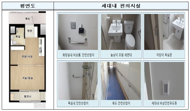 실내는 문턱을 없앴다. 복도와 욕실 등 안전손잡이와 욕실, 침실 비상콜, 높낮이 조절 세면대는 기본이다.