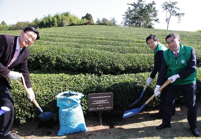 이를 위해 11월 2일 전남 보성군 보성읍에 위치한 보향다원에서 스타벅스커피 코리아 이석구 대표이사<위 사진 왼쪽>와 농식품부 이준원 차관<사진 중앙>, 한차협 김영걸 회장<사진 오른쪽>이 참석해 국내 차 산업 경쟁력 강화를 위한 상생협력 업무 협약식을 진행했다.