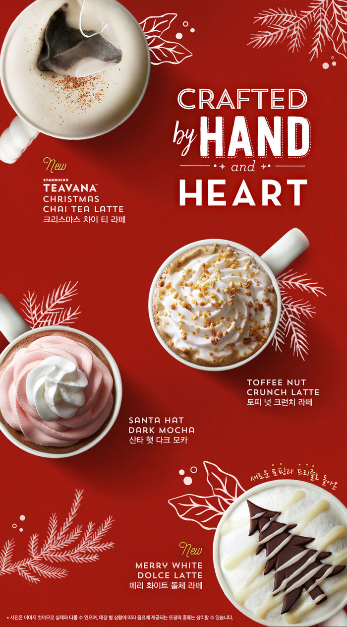 스타벅스커피코리아가 선보인 토피 넛 크런치 라떼, 산타 햇 다크 모카, 메리 화이트 돌체 라떼, 크리스마스 차이 티 라떼다.