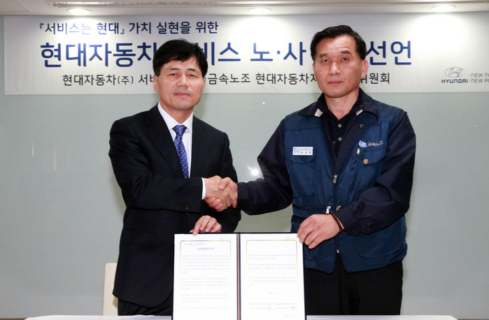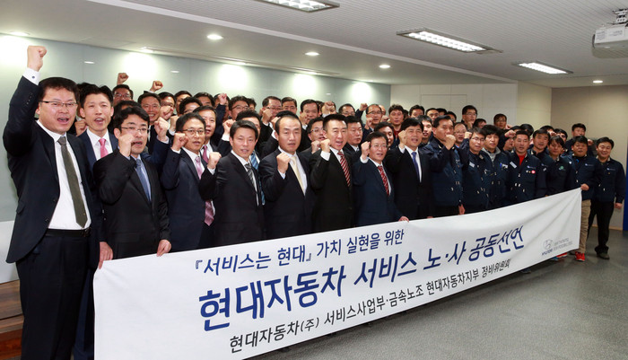현대자동차 서비스부문 노사는 6일 원효로 사옥에서 서비스사업부장 김태석 상무, 노동조합 정비위원회 이성하 위원장 및 전국 23개 서비스 센터장과 노조 지회장 등 100여명의 노조원과 임직원이 참석한 가운데 ‘서비스는 현대’ 라는 가치 실현을 위한 노사 공동선언문을 선포했다.