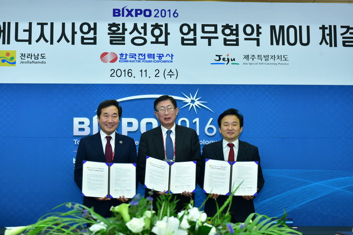 [화학신문 김영민 기자]한국전력은 BIXPO 개최 11월 2일 김대중컨벤션센터에서 전라남도 및 제주특별자치도와 신재생에너지사업 활성화를 위한 업무협약 MOU를 체결했다.