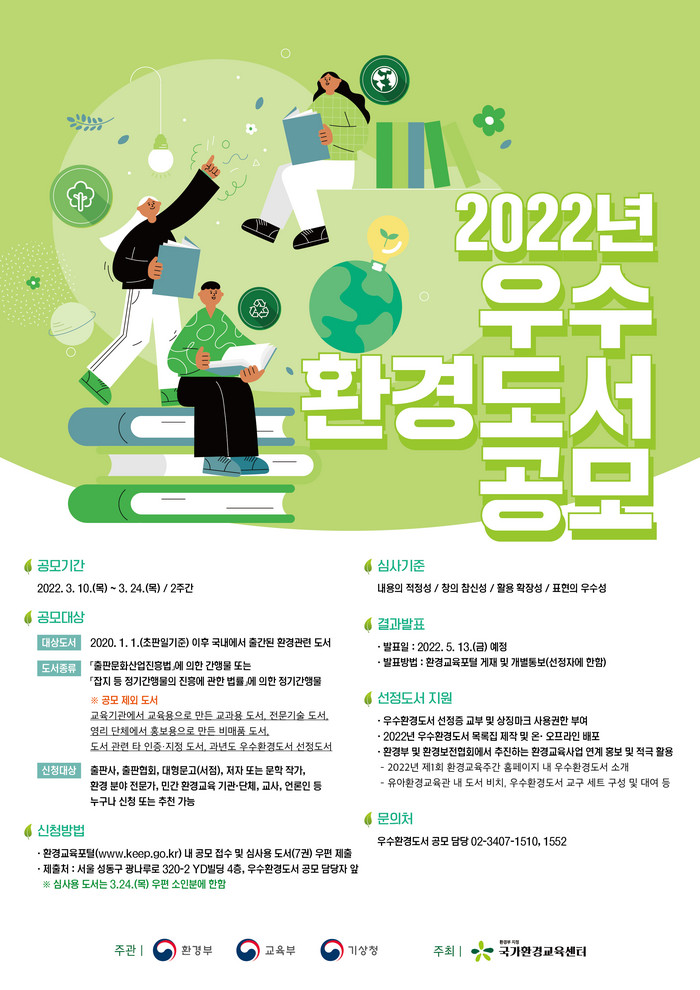 2022년 우수환경도서 선정도서는 분야별 전문가로 구성된 심사위원단의 평가 5월 중 발표 예정이다. 선정 도서는 선정증 교부 및 상징마크 사용권한이 부여되고, 목록집을 제작해 온오프라인에 배포할 예정이다. 접수는 환경교육포털(www.keep.go.kr)의 공모전 페이지에서 가능하며, 심사용 도서는 마감일 우편 수인분에 한해 운영사무국으로 7권씩 제출해야 한다. 문의 환경보전협회 운영사무국(02-3407-1510, 1552)으로 하면 된다.