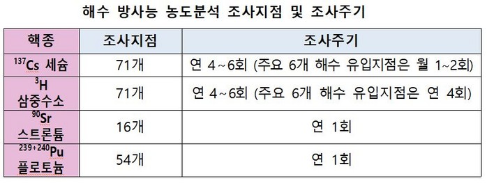 지난해부터 삼중수소에 대한 해수 방사능 감시를 국내 해역 54개 정점에서 71개 정점으로 확대했다. 수입수산물에 대한 방사능 검사 시간을 기존 1800초에서 1만초로 강화해 방사능 검사 결과의 정확성을 대폭 높였다고 밝혔다.